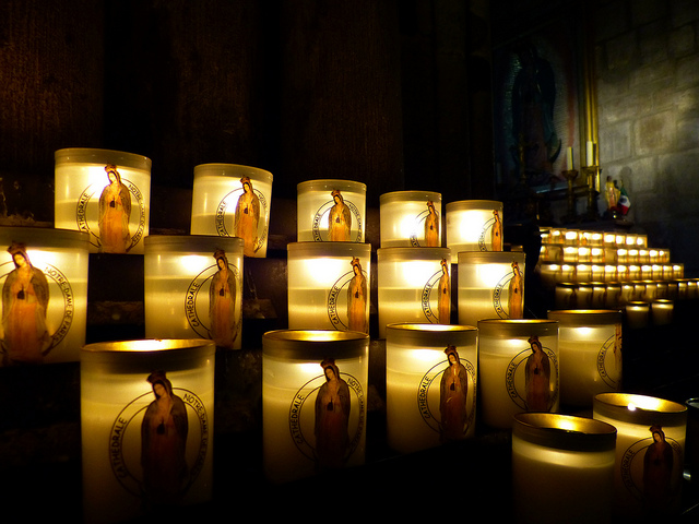 時は下って約200年後、この教会堂に金のマリア像を捧げることになり、当初夏に予定されていたセレモニーが天候不順により12月8日に延期されました。ところが、この日もあいにくの天候で延期となる所でしたが、待ち切れないリヨン市民が窓辺に灯をともした蝋燭を置いた事が、光の祭典の起源となっています。