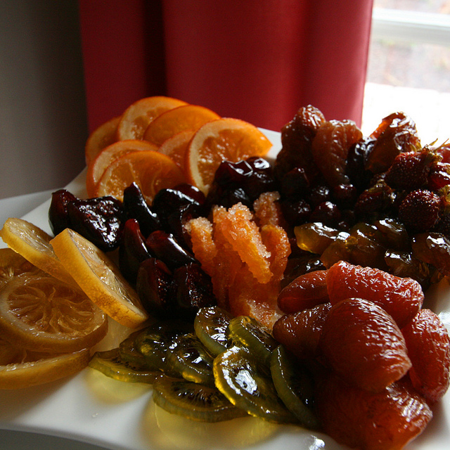 コンフィとは砂糖漬けのこと、つまりフリュイ・コンフィはフルーツの砂糖漬けです。元々は保存食として、フルーツを砂糖でじっくりと煮詰め乾燥させたものですが、フランス人、特に南仏の人が好んで食べるお菓子です。