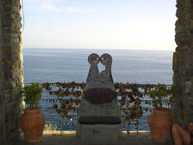 チンクエテッレで一番有名な観光地といえば、愛の小道。リオマッジョーレとマナローラをつなぐ海岸沿いの遊歩道で、崖沿いの道を30分ほど歩く本当に気持ちいい散歩コースです。道の中間辺りには、恋人同士がキスをしているオブジェがあり、その後ろの手すりには南京錠が大量にぶら下がっていて、恋人同士が愛を誓い合い南京錠をかけるスポットとして有名です。日本もイタリアも若者は同じですね 笑