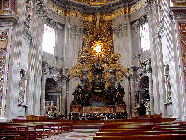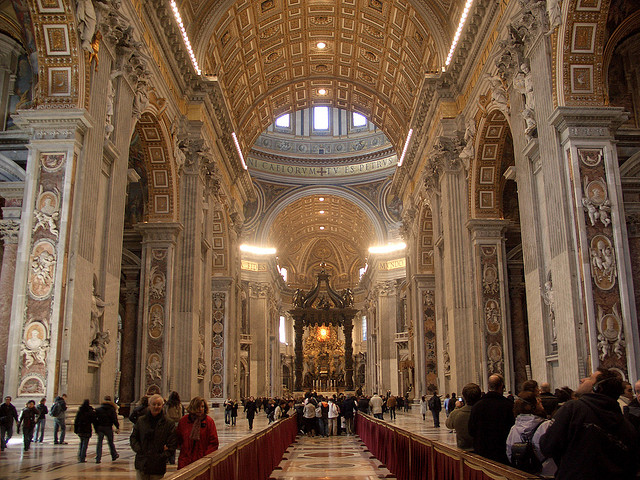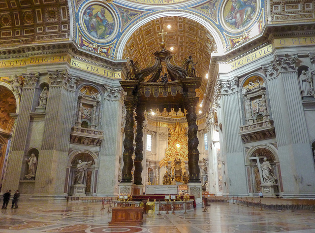 その大天蓋の下に聖ペテロが眠っているのです。その奥には司教座、手前にはミケランジェロのピエタ像などがあり、荘厳な内部の装飾にも圧倒されてしまいます。