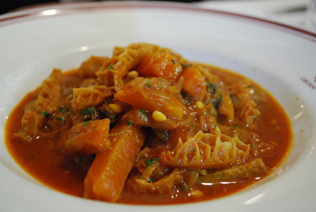 Trippa alla Fiorentina – The Grill, Grossi Florentino AUD22, by avlxyz, CC BY-SAトリッパ(Trippa)はハチノスと呼ばれています。牛の第二胃を煮込んだ料理になりますが、形状が蜂の巣のように見えることからそのように呼ばれているようです。好き嫌いが大きく別れる食べ物ですが、ホルモンが好きな方は喜んで食べられるでしょう。もともとはイタリアの北部の料理となります。香草野菜の人参や玉ねぎなどとトマト、ひよこ豆などを入れて長時間煮込んだ料理です。イタリア風もつ煮込みのようなものですが、ワインとも相性が良く、スープも楽しめるので冬にはピッタリのひと皿です。