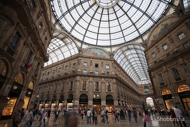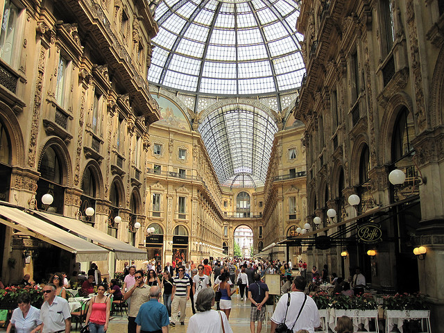 by robinbos, CC BY建物天井付近のフレスコ画はアジア、アメリカ、アフリカ、ヨーロッパの4大陸を表現していて、硝子天井も見どころです。是非アーケード内では、天井と床に注目してください。ガリレア内のプラダ本店の斜め前にある牛のモザイクがあります。そこでかかとのみで止まらずに3回転すると幸せになれると言われています。ミラノに来たんだし、イタリアブランドブティックで何か買い物を!と考えている人は是非立ち寄って見てください。