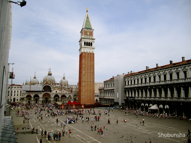 Piazza San Marco, by Kaeru, CC BYそして、この近辺には、この福音記者マルコに捧げられたサンマルコ寺院、ドゥカーレ宮殿、時計台、鐘楼があります。また、1分でアドリア海に面した風景が広がります。そして1720年創業のカフェ・フローリアンはカフェラテの発祥とも言われております。生演奏を聴きながらサンマルコ広場を眺めるというのもヴェネチアならではの貴重な一時になるでしょう。夜のサンマルコ広場は人だかりが少なくなり、またとても美しいので見どころです。