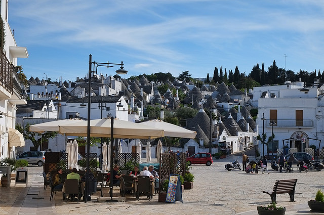 プーリアで一番有名な都市といえば、アルベロベッロ。トゥルッリと呼ばれる白い漆喰の壁にとんがり屋根の小屋が並ぶ風景で良く知られており、南イタリア周遊のツアーなどで訪れられることもしばしば。このトゥルッリはモルタルなどの接着剤を使用せず建てられており、16世紀ごろ領主が徴税逃れのため、すぐに壊せる簡易な建物を農民に作らせたことから広まったそう。