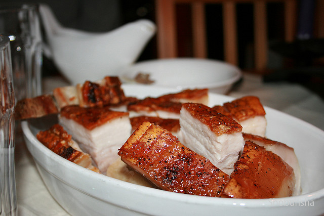 ローストしたポークリブです。ノルウェーのクリスマス料理の中では、最も人気があるのではと思います。皮の部分がカリカリにローストされていて、脂っこく感じないのが美味しさの秘密でしょう。サワークラウトとジャガイモが添えられます。