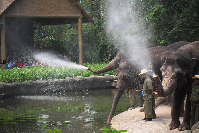 シンガポールの夜観光の定番。トラムに乗って夜の動物たちを観察します。 薄明りの中で見る動物たちは野性味も倍増!夜にお出かけするドキドキ感も相まって、子どもたちも大喜び間違いなしです。日本語トラムも運行されていますので、乗りたい方は事前にインターネットで時間を調べてから出かけましょう。着いたらまずトラムを予約します(英語トラムの場合は予約不要)。出発時間までは、トレッキングコースを見たり、入口付近のファイヤーショーを見たり、ごはんを食べたりお土産屋を物色したりと、あっという間に時間が過ぎますよ。トラムに乗った後は、人の流れに乗ってアニマルショーへ!少し並ぶかもしれませんが、絶対に見てほしい面白さです。帰りは遅くなるでしょうから、翌日の予定はゆったりめに組むのがおススメです。