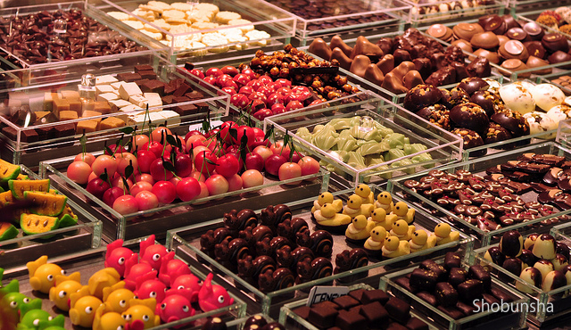 実は、カタロニア(バルセロナのある地域)は、チョコレートでも有名です。バルセロナの町を散策すると多くのチョコレート店が目につきます。是非、訪れたい観光スポットのひとつ「ボケリア市場」でも、スペインハムなどに負けないくらいの規模のチョコレート店があります。