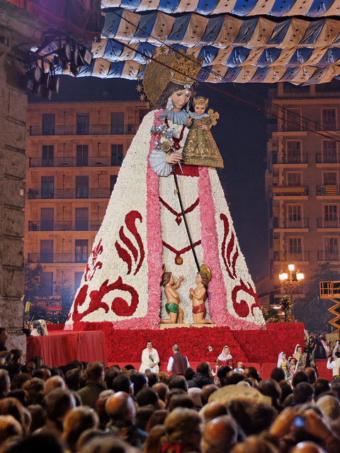 ファリェーラといわれるバレンシアの民族衣装に身を包んだ女性や男性たちが、バレンシアの大聖堂に隣接するビルヘン広場に設置された巨大なマリア像に献花します。このマリア像は首から下が木製の三角形の枠組みになっており、そこに花を差し込んでいき、最終的に花を纏ったマリア像が出来上がります。