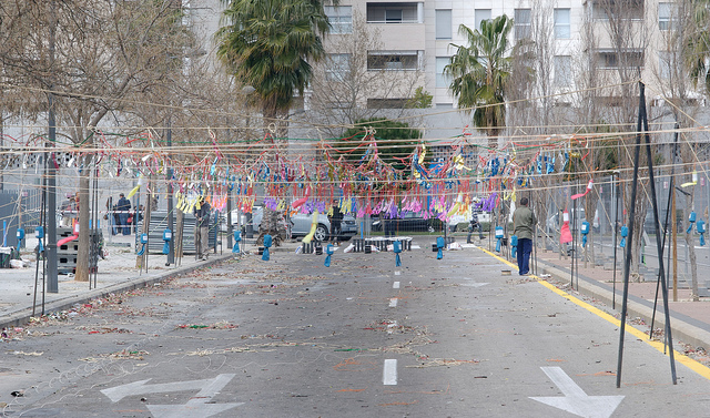さて、バレンシアの3月のお祭りと言えば、バレンシアの守護聖人である聖ホセの火祭りことLas Fallas(ラス・ファリャスもしくはファジャスと発音)です。3月に入ると、町のあちこちで子供たちが爆竹を投げて遊び、ドーナツやチュロスなどのたくさんの屋台、ボテジョンといってスーパーで買ったお酒を広場で飲んでワイワイやる若者たちが見られます。(ボテジョンする若者は祭りの時期だけとは限りませんが・・・)街中は3月になると、ずっとお祭り騒ぎとなります。