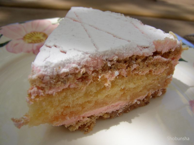 側面はスライスアーモンドでコーティングしてあります。メレンゲのさっくり感、アーモンドのこんがりとした香り、スポンジのしっとり、バタークリームとスポンジのしっとり、そして最後にまたメレンエのさっくりで、なんともリッチなケーキです。