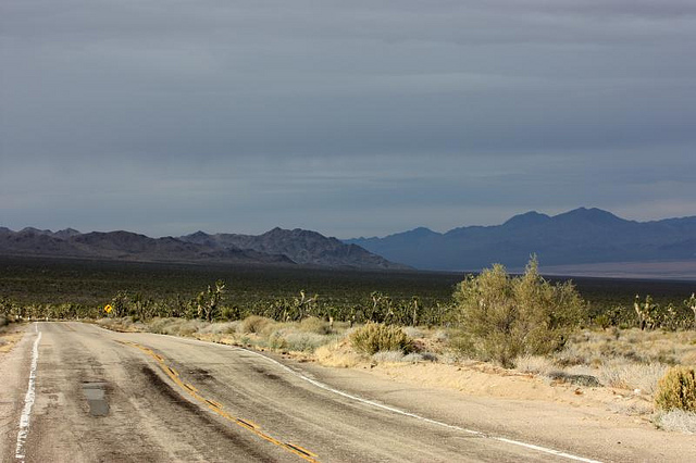 モハベ国立自然保護区はモハベ砂漠の一部で、デスバレーとジョシュア国立公園の間にあります。辺りには、松の木にシュロのバサバサを適当に刺してくっつけたようなジョシュアツリーが一面に生えています。この木はモハベ砂漠が原産で、日本ではなじみがない奇怪な格好をしています。日本でなじみがないと言えば、西部劇の決闘シーンになると後ろでゴロゴロ転がっている草も日本ではなじみがありませんが、モハベ砂漠のあたりでは大量にゴロンゴロンと転がっています。モハベ砂漠では砂漠の動植物も多く観測されています。