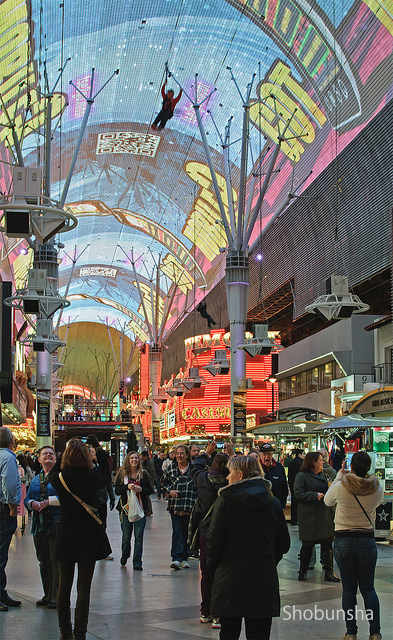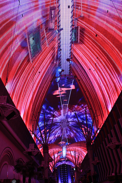 ラスベガス・ダウンタウンのフレモント・ストリート5区画を蓋うアーケードで、特に有名なのは、ここで行われる音と光の無料アトラクションです。天井を蓋う長さ約457m、幅約27mのスクリーン”ビバ・ビジョン”は世界最大で、1250万あるLED電球のディスプレイに映し出される映像と、55万ワットの迫力あるサウンドシステムを使った6分程のショーが、毎日日没から深夜まで1時間毎に行われます。