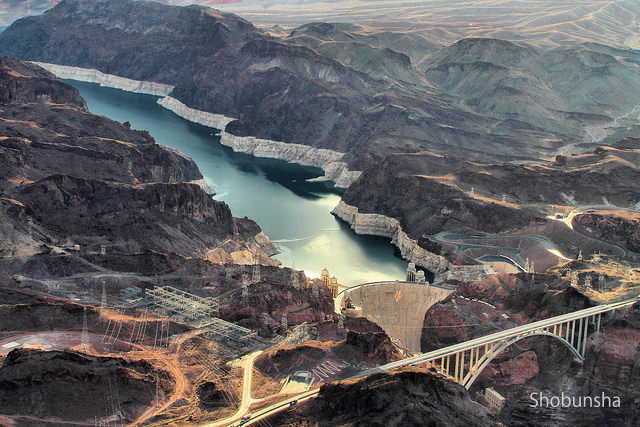 ラスベガス中心地から南東に車で約50分程行った、アリゾナ州とネバダ州の州境にあたるコロラド川ブラック・キャニオンに位置するコンクリート重力式アーチ型ダムです。5年の歳月をかけて1936年に完成しましたが、その建設は過酷なもので、100名以上の労働者が犠牲になったと言われています。