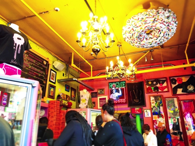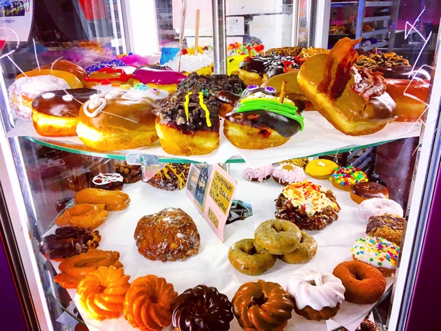 個性的な眩しいピンクの外観やネオン装飾、サイケデリックなステンドグラスやくるくる回るドーナツのショーケースなどは、絶対に他のドーナツショップではお目にかかれない代物でしょう!