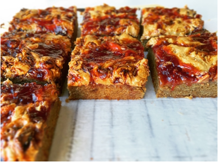 ちなみに、「ピーナッツバター&ジェリー」のこの「ジェリー」の意味は、私たちが想像する、あの「ぷるるんっとした冷やして食べるゼリー」のことではなくて、アメリカでは一般的にイチゴやブルーベリー、マーマレードなど「パンに塗って食べる」あの「ジャム」のことを指します。(一例の写真は「ピーナッツバター」と「いちごジャム」で私が作る黄金色のブラウニー「ブロンディー」です)