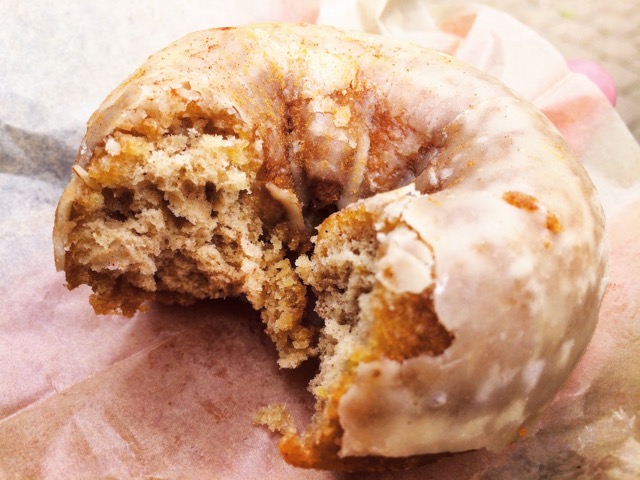 このドーナツ本当に大きく、普通のドーナツの1.5倍くらいのサイズがあります。モッチモチのきつね色に揚がったドーナツの生地の全体を覆うようにシンプルなお砂糖のグレーズでコーティングされています。弾力の良い噛み応えのある生地は噛むごとに爽やかなりんごの風味がじんわり、コーティングされたお砂糖のグレーズがじゅわっと口の中に広がり、たまりません!
