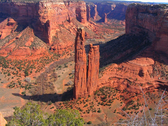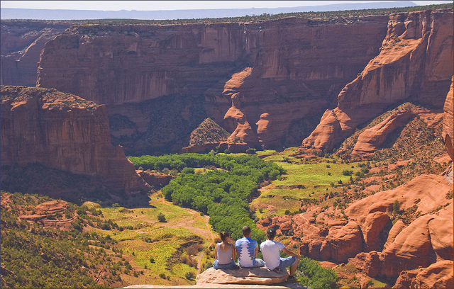 アメリカのアリゾナ州北東に位置するキャニオン・デ・シェイ国定公園周辺は、アメリカの先住民ナバホ族の居住区域であり聖地でもあります。切り立った崖や赤茶色のごつごつした景観と谷底の緑色が見事なコントラスとを描いていて壮大な景観ですよね。
