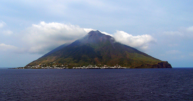 イタリア南部の地中海に浮かぶ島ストロンボリ島にある火山で、現在も活発な活動が確認されている活火山です。火口から激しく溶岩が吹き上げ飛び散る様子が有名で、そのような噴火を「ストロンボリ式噴火」と呼ぶ語源にもなった火山です。