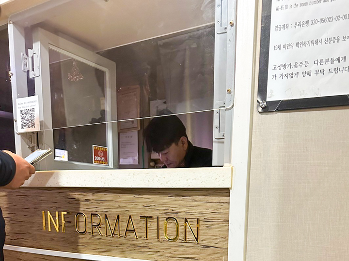 宿泊料金は60,000ウォンでした。だいたいの相場は40,000~60,000ウォン休憩は3時間で20,000ウォンくらいになります。支払いは現金、クレジットカードが利用可能。支払いをするとルームキーとアメニティが渡されます。