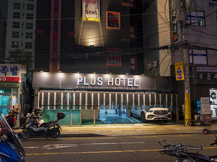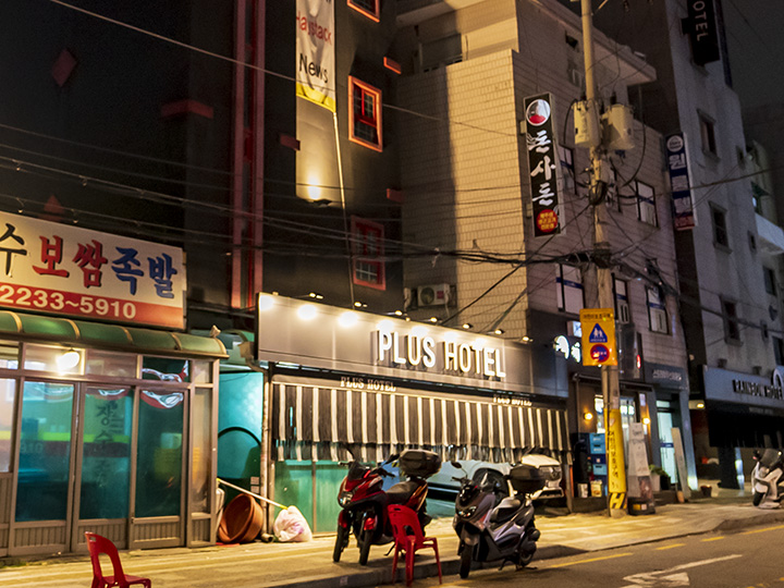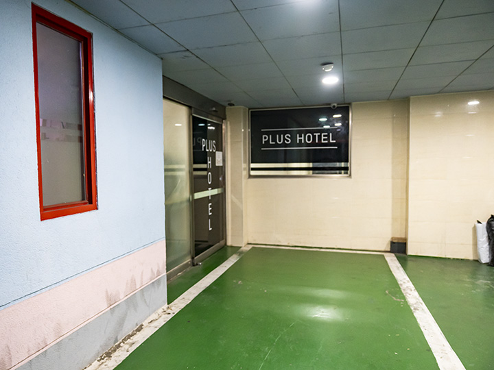 早速、「hotel」と書かれた看板の宿を発見しました。ホテルの名前は「プラス・ホテル」です。
