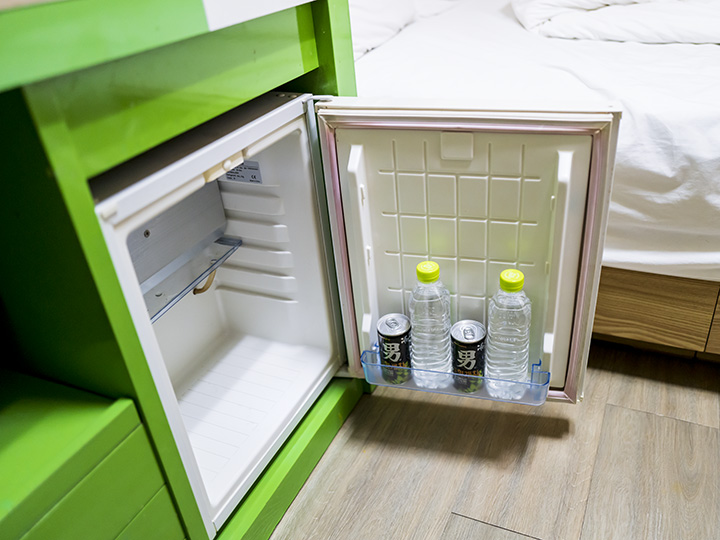 室内にはベッドのほかに作業デスク、冷蔵庫、ドライヤーなど一般的なホテルと変わらない設備です。