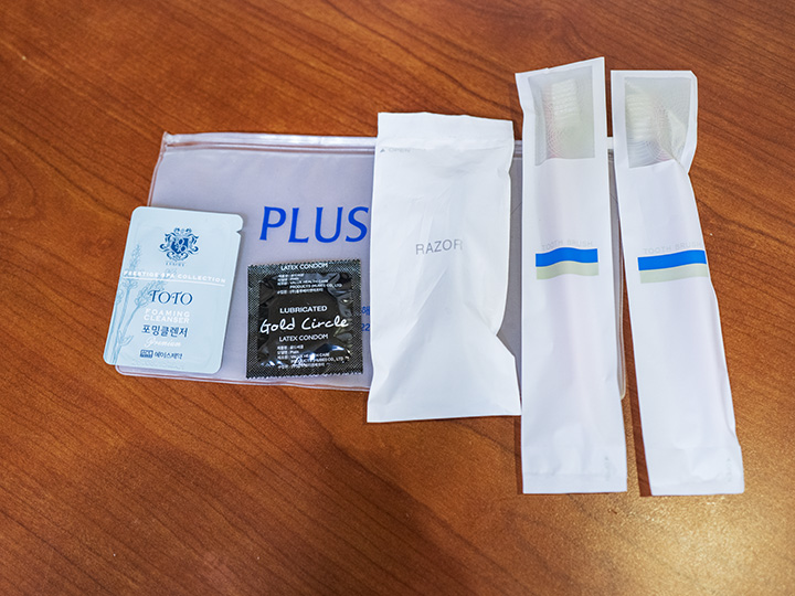 フロントで渡されたアメニティの中身は、洗顔フォーム、剃刀、歯ブラシ2本等でした。
