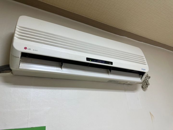 エアコンも完備。エアコンのリモコンはハングル表記のみでしたが翻訳アプリで解読することができました。
