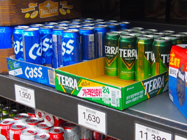 韓国のお酒も購入できます。試してみたい韓国ビールは「CASS」と「TERRA」。CASSはあっさりと爽快なのどごしで飲みやすいビール、TERRAは苦みとコクがありのどごしがしっかり目のビールとなっています。