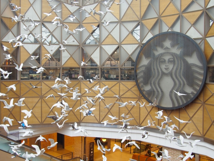 外装はおしゃれなデザインのガラス張り。お店の前で、はばたく無数の鳥たちのモニュメントが出迎えてくれます。