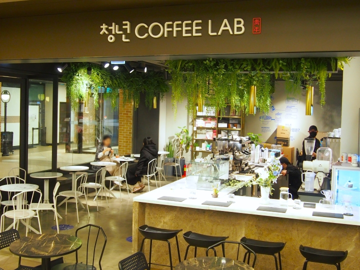 「青年コーヒーラボ」の看板メニューは、ミルクベースにエスプレッソ、チョコレートパウダーとコールドブリュークリームが入った「ベルベットラテ」です。