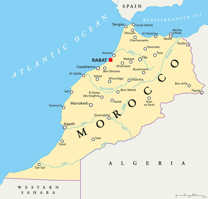 モロッコは、北アフリカ北西部のマグリブに位置する立憲君主制の国家。東はアルジェリア、南は西サハラと国境を接し、北はジブラルタル海峡を隔ててスペインと対面しています。