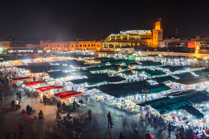 特にマラケシュ旧市街にある「ジャマ・エル・フナ広場」には、100以上の屋台が建ち並び、昼夜問わず活気に溢れています。モロッコで一番大きな「スーク」と呼ばれる市場もあり、世界中から多くの観光客が訪れています。