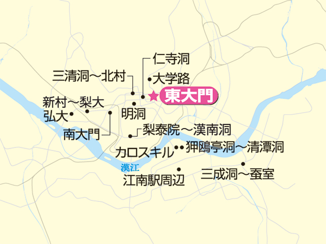 東大門は明洞の東側に位置し、明洞からは地下鉄1本で行くことができます。北側には学生街で有名な大学路がありますよ。最寄り駅は、北側の地下鉄1・4号線東大門駅と、南側の2・4・5号線東大門歴史文化公園駅。