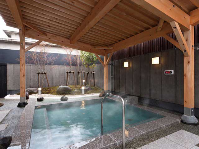 1階は気軽に立ち寄れる観光案内所。2~3階が浴室。浴槽には黒部川の石を使用しており、源泉かけ流しの湯も贅沢。無色透明で、しっとりすべすべになる美肌の湯をたっぷりと堪能できる。