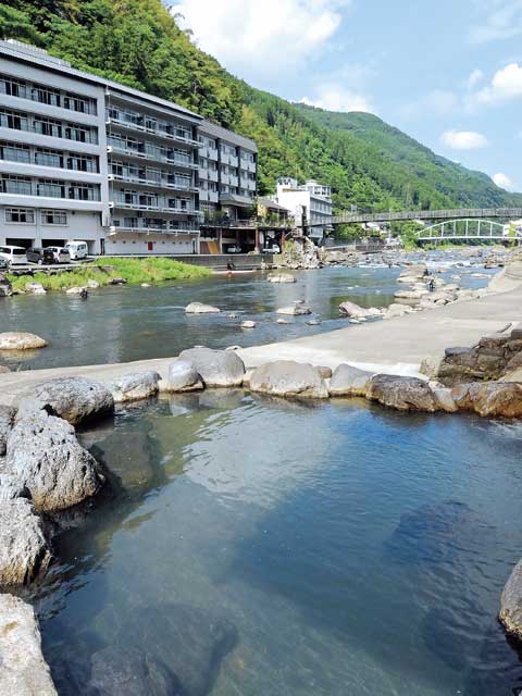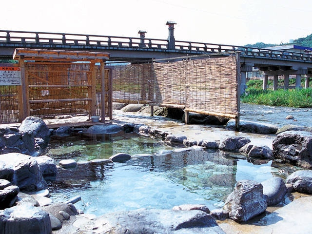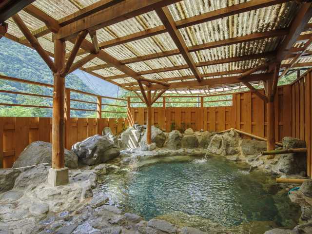 吉野川沿いにある素朴な入浴施設。開放的な空間に大小二つの岩の露天風呂があり、週ごとに男女を入れ替える。簡単な脱衣所と管理棟があるが、洗い場はなく、石けん・シャンプーも使用不可。