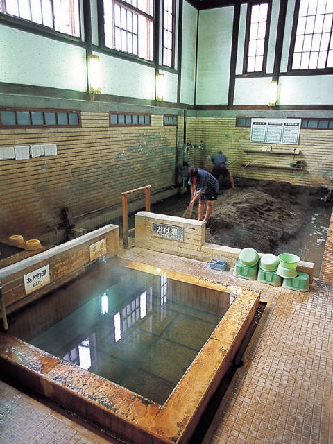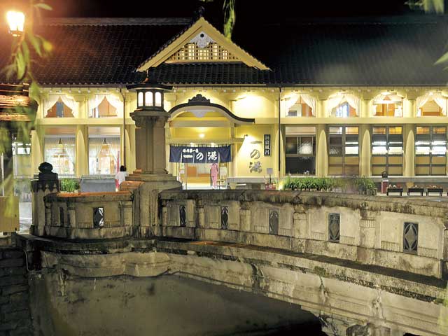 明治27(1894)年建造の木造三層楼の公衆浴場で、重要文化財に指定。「神の湯」「霊の湯」の2種類の浴室があり、湯上がりに貸し浴衣やお茶などが付くコースがある。