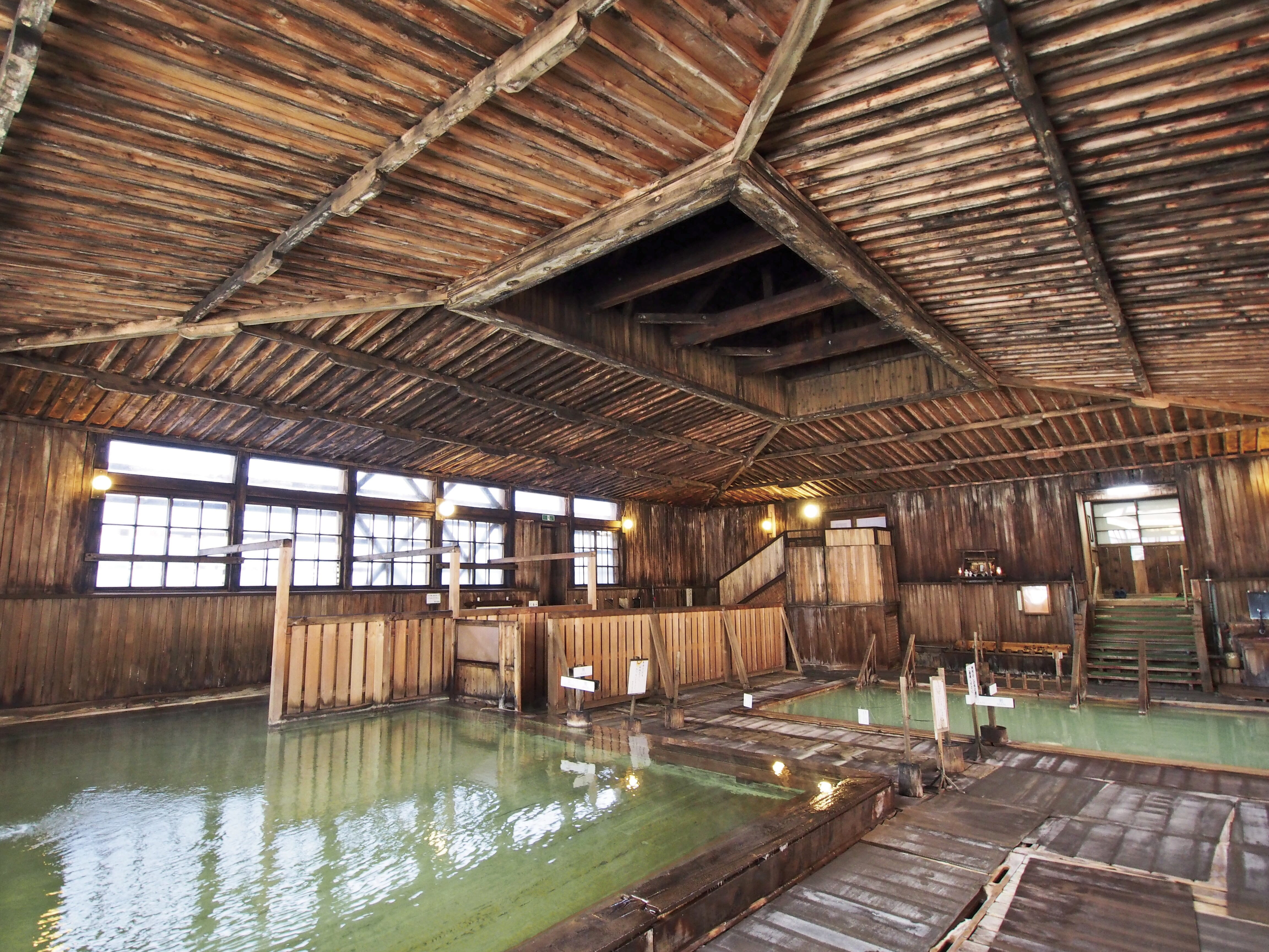 名物の千人風呂は、柱が一本もない総ヒバ造りの広大な空間が広がる。乳白色の薬効の高い湯に浸かりながら湯治場の風情が楽しめます。