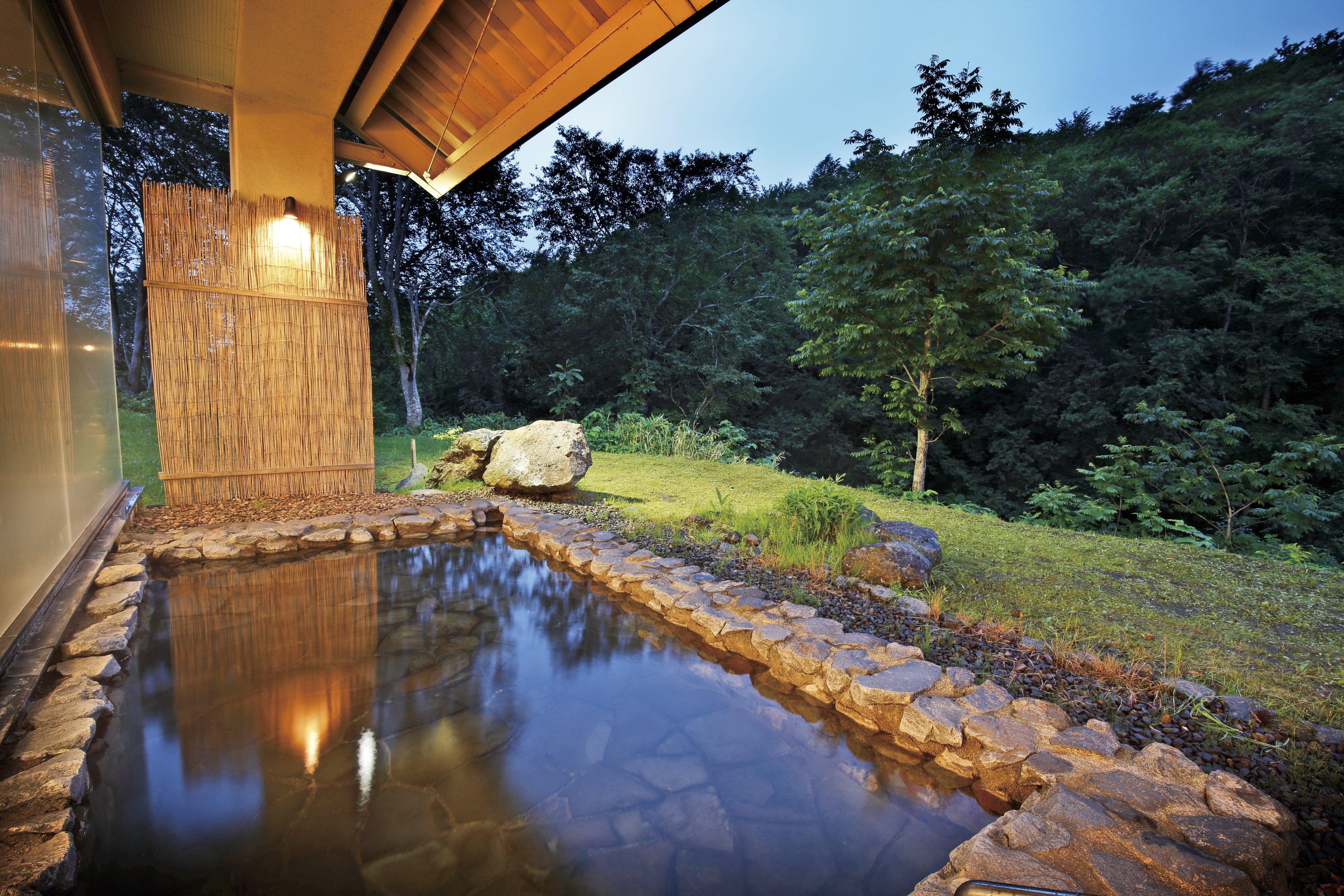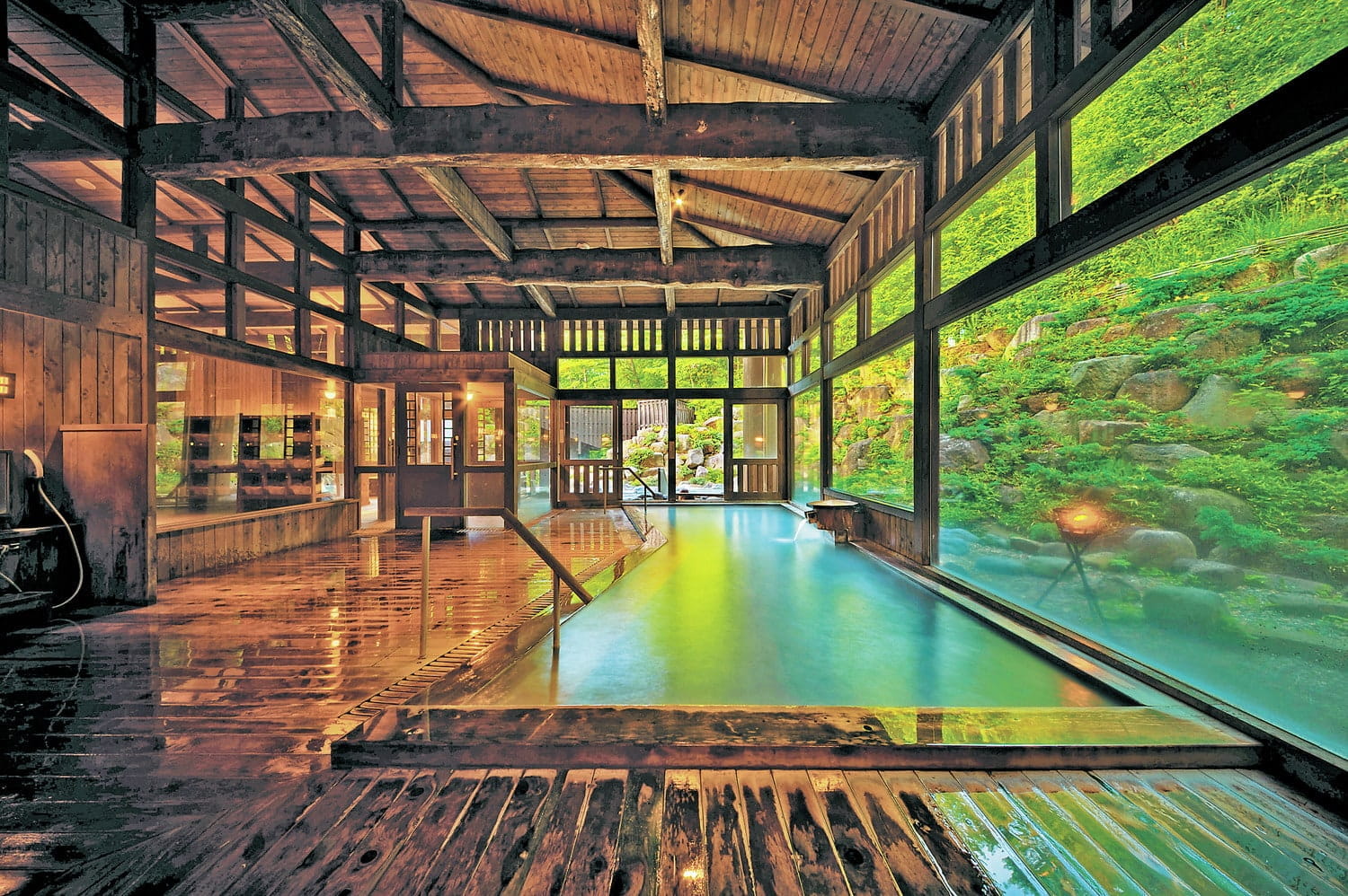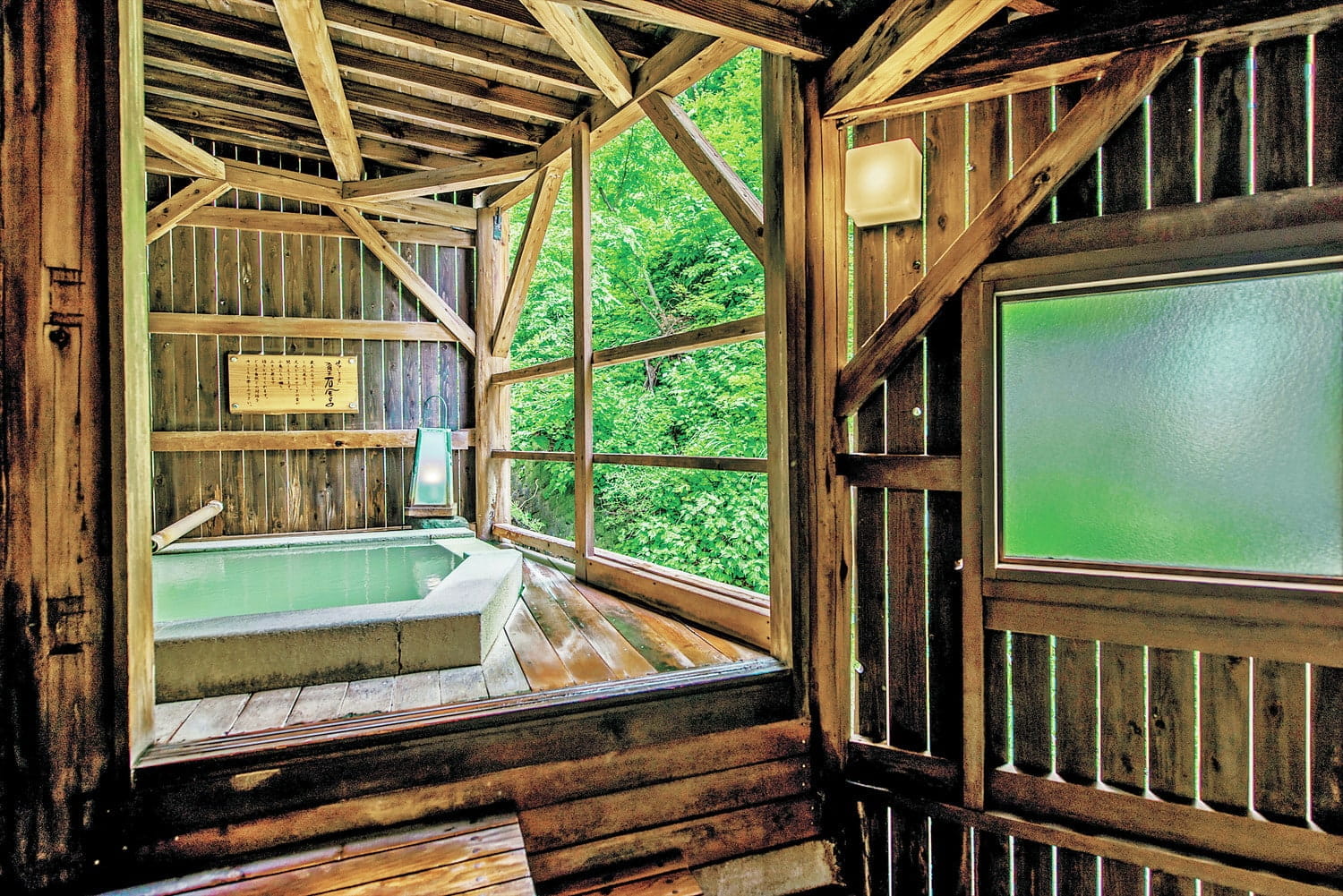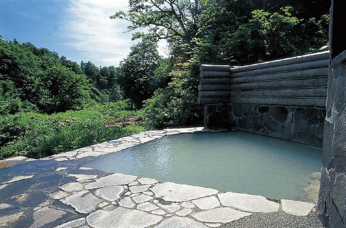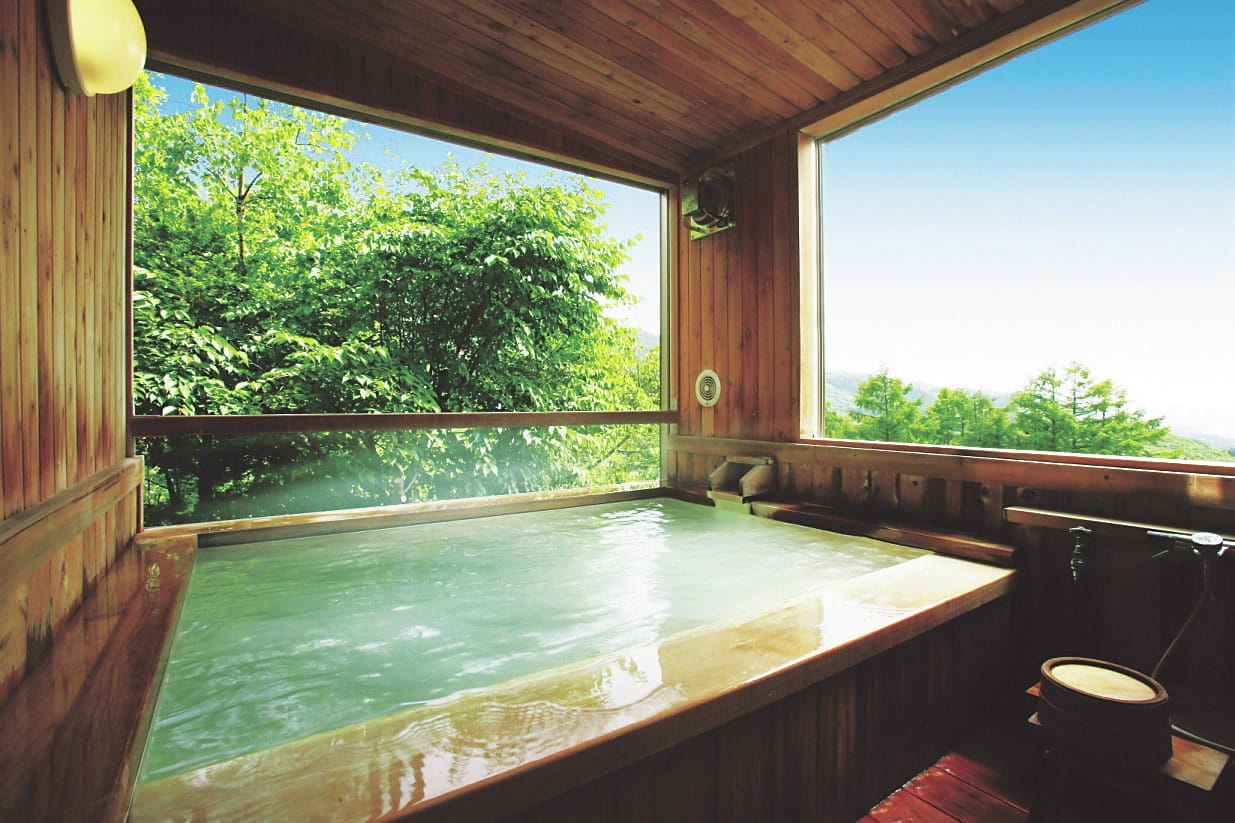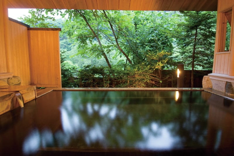 随筆家の大町桂月が愛したことでも知られる、ブナの原生林に囲まれた宿。浴室では源泉の上にヒバの浴槽が設えられており、底板から混じり気なしの新しい湯が湧き上がります。