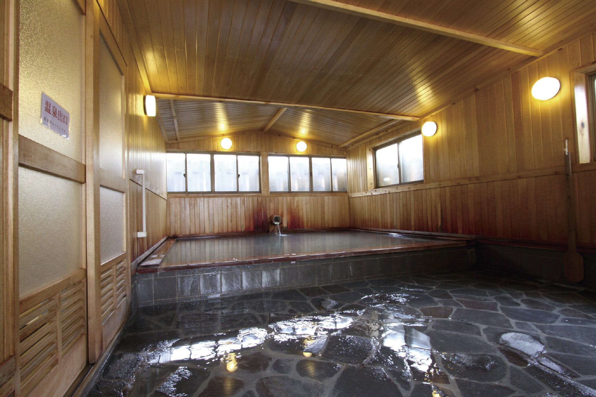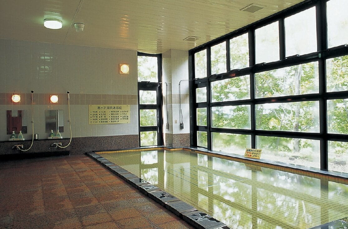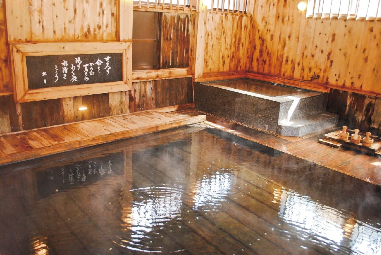 肌がつるつるになると評判の寒水沢温泉の源泉掛け流しの湯。大浴場のみだが、良質の湯を存分に楽しめます。