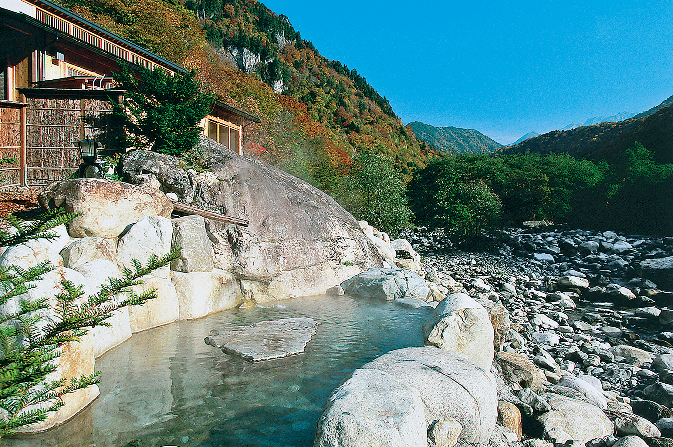中部山岳国立公園内にあり、蒲田川にかかる吊り橋の先にある宿。内湯と5つの露天風呂で2種類の泉質の温泉が楽しめます。イワナの骨酒やまれに熊汁も登場するなど料理は郷土色豊か。