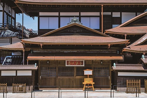 明治27(1894)年に改築された現役の公衆浴場。1994年に公衆浴場としては初めて重要文化財に指定されました。何度も改築を繰り返すうちに、木造三層楼の威風堂々たるたたずまいに。当時の面影が残る館内も風情満点で、石造りの浴槽では肌ざわりがなめらかな美人の湯を源泉かけ流しで楽しめます。2019年から営業しながら保存修理工事中。