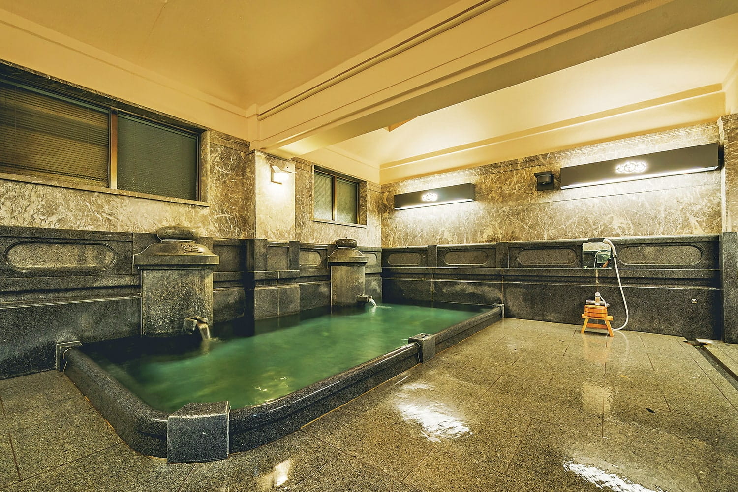 もとは皇室の随伴者用の浴室といわれるだけあり、大島石の浴槽や大理石の壁など風格ある造りが特徴。