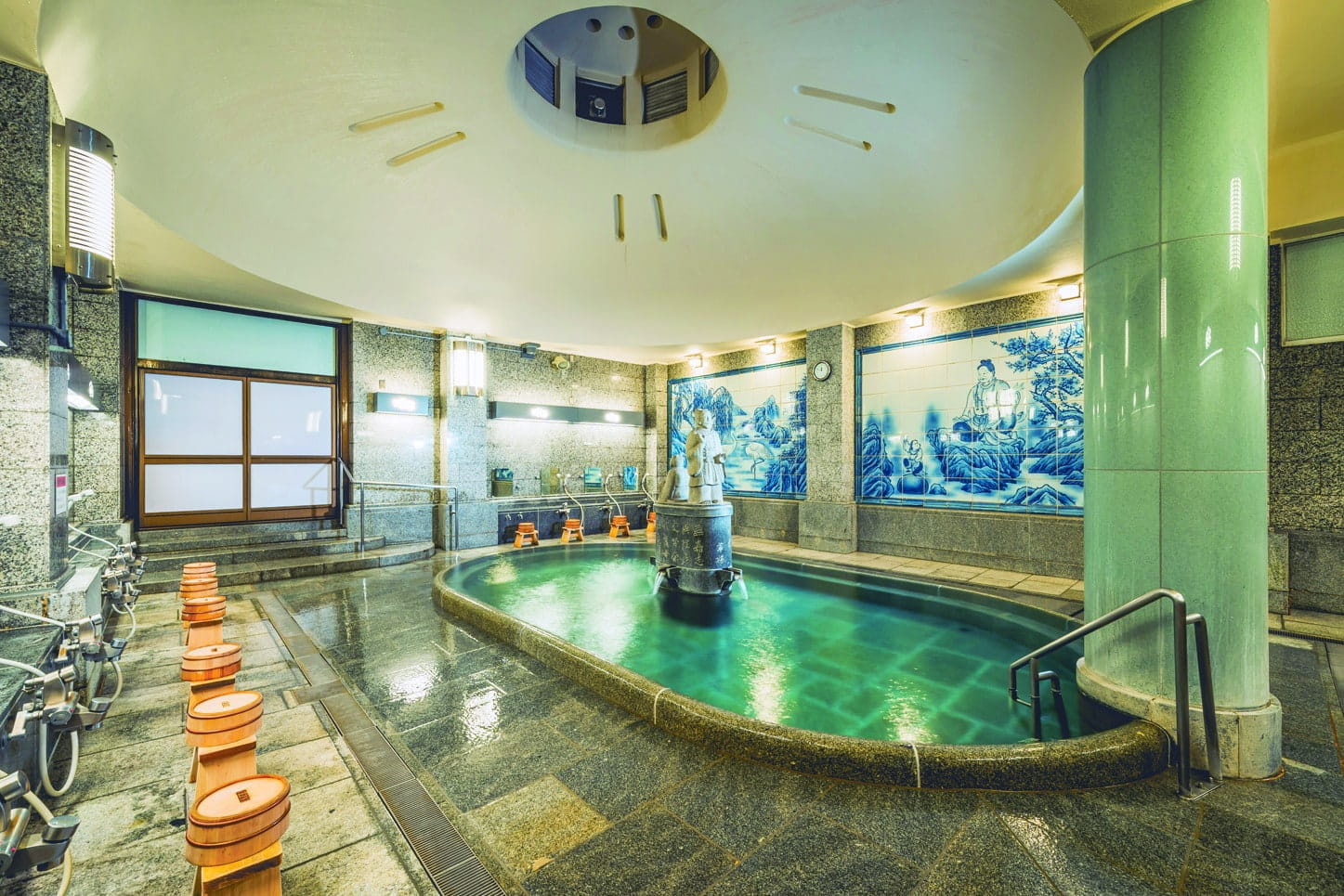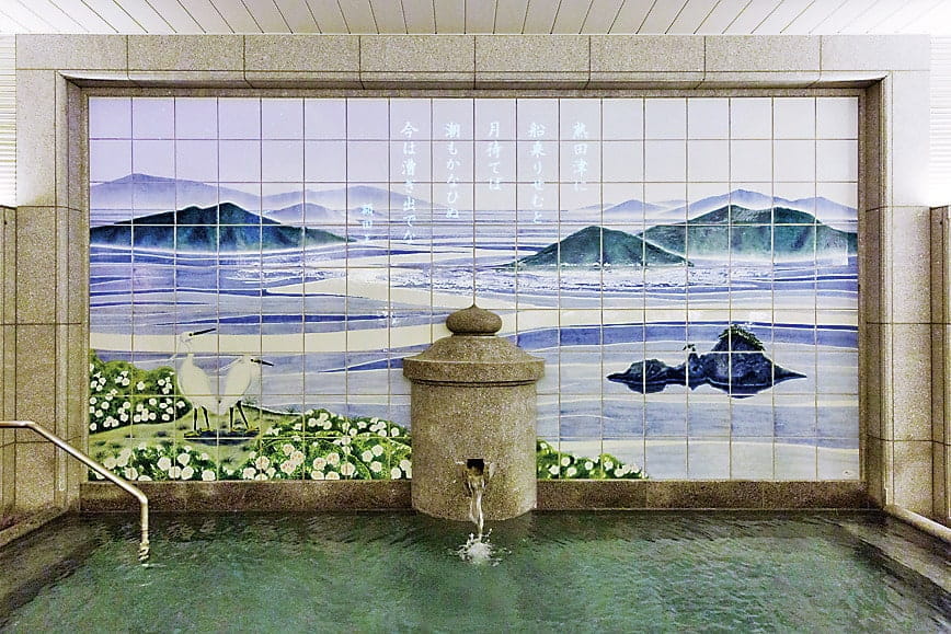 浴槽を囲む3面に配された砥部焼の陶板壁画は見事!