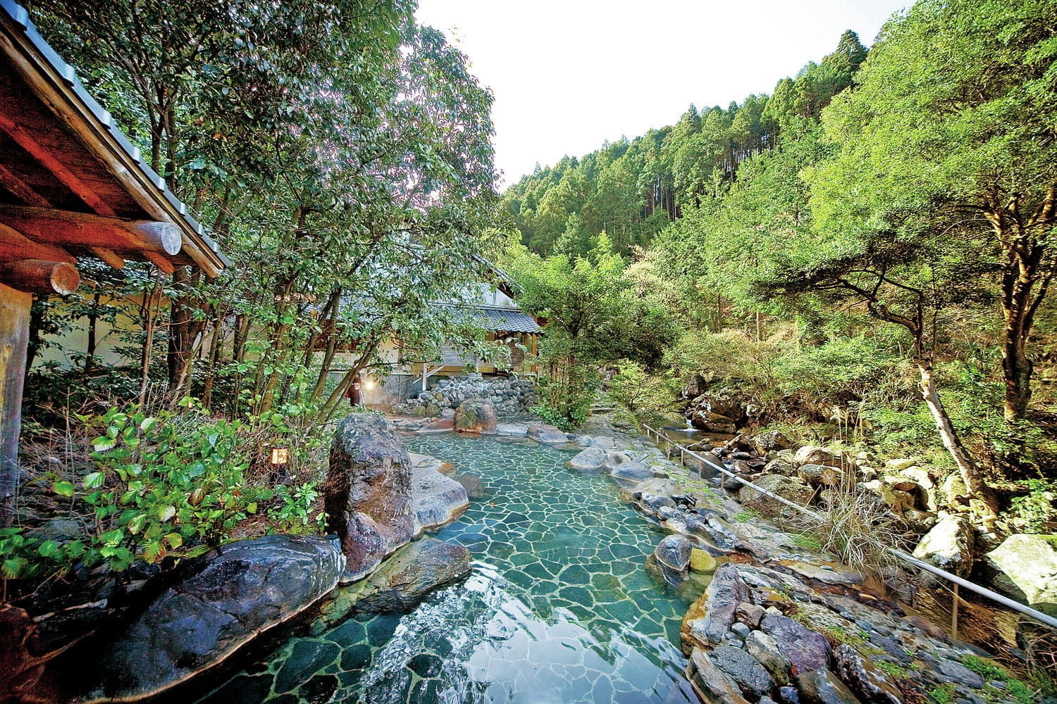 嬉野温泉街の中心部から少し離れた場所に建つ宿「大正屋 椎葉山荘」のお風呂。椎葉川沿いにある露天風呂は広々としています。渓流が間近に迫る景観はすがすがしく、開放感満点。