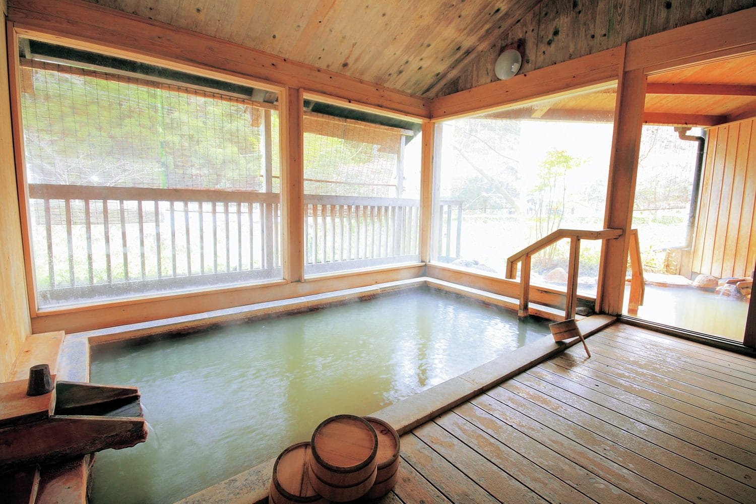 源泉掛け流しの湯がなみなみと注がれる「八右衛門の湯」が名物。丸太の梁がむき出しの大浴場は、硫黄の香りに包まれていて風情満点です。周囲の森を眺めながら入浴できる3つの貸切風呂も人気です。