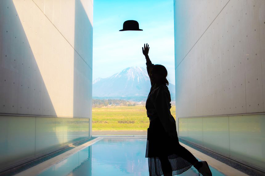 今月のコラムは、鳥取県の伯耆町(ほうきちょう)にある植田正治写真美術館から、一枚の借景美をお届けします。写真集の素材にもなっている帽子のシルエットが、ユーモラスなのです。