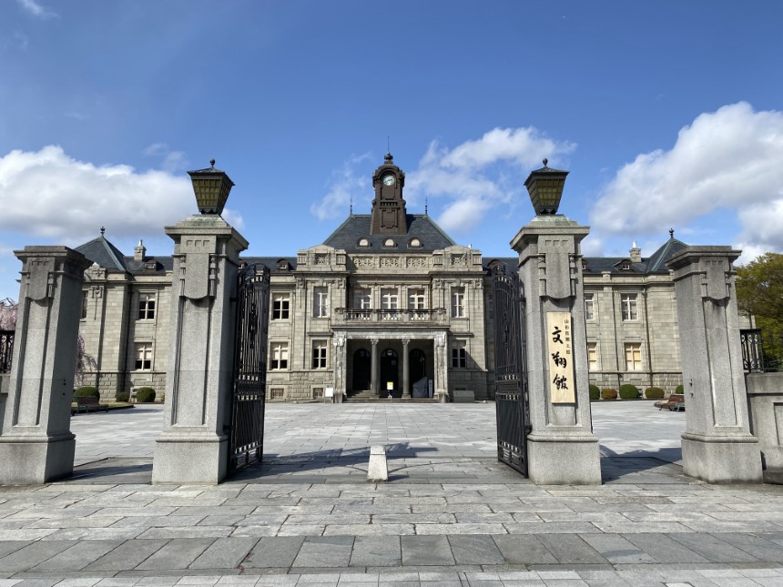 霞城公園を出て歩いていると、クラシカルな雰囲気の建物が見えてきます!こちらは、大正5(1916)年に、現在の場所に完成した英国近世復興様式の文翔館。大正建築の傑作ともいわれており、国の重要文化財に指定されています。