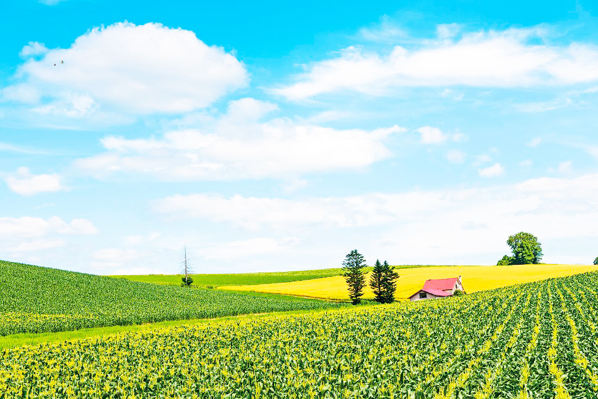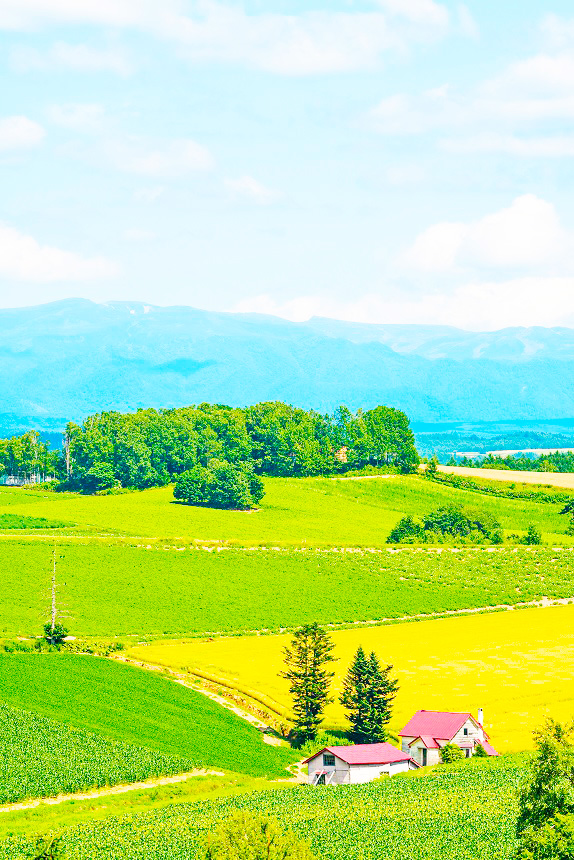 丘の中央に、赤い屋根の家が一軒。「丘のまち・びえい」を象徴する丘陵風景です。プロアマ問わず多くのカメラマンが撮影に訪れるフォトスポットとして有名な場所です。季節によって変わるパッチワークのような景色を楽しめますよ。