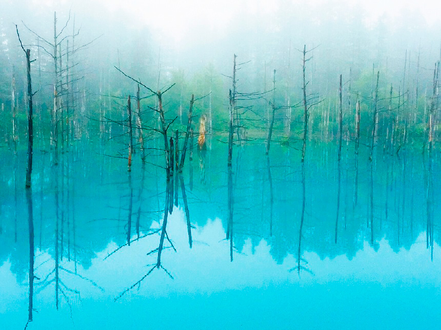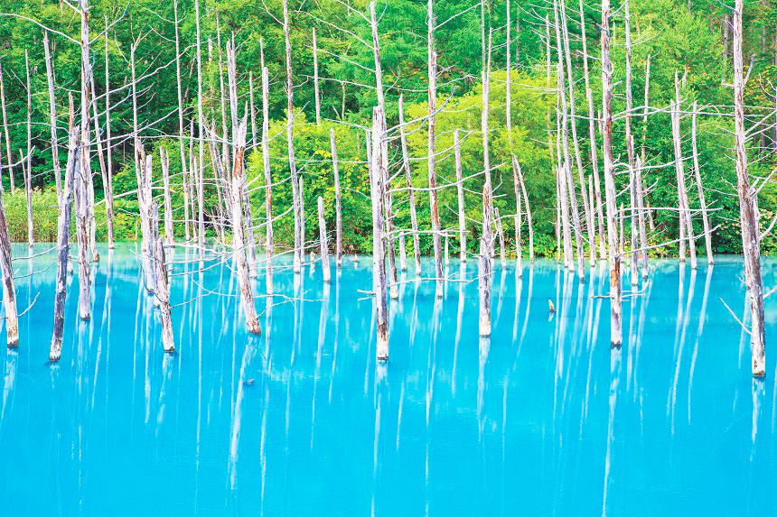 時間や天候によって池の色が変わり、池の青と立ち枯れた木のコントラストが美しい有名スポット。「ビエイブルー」とも呼ばれる珍しい青色は必見です。水が青い理由は、美瑛川に滝の地下水が混ざりコロイド状態になったからだと考えられています。