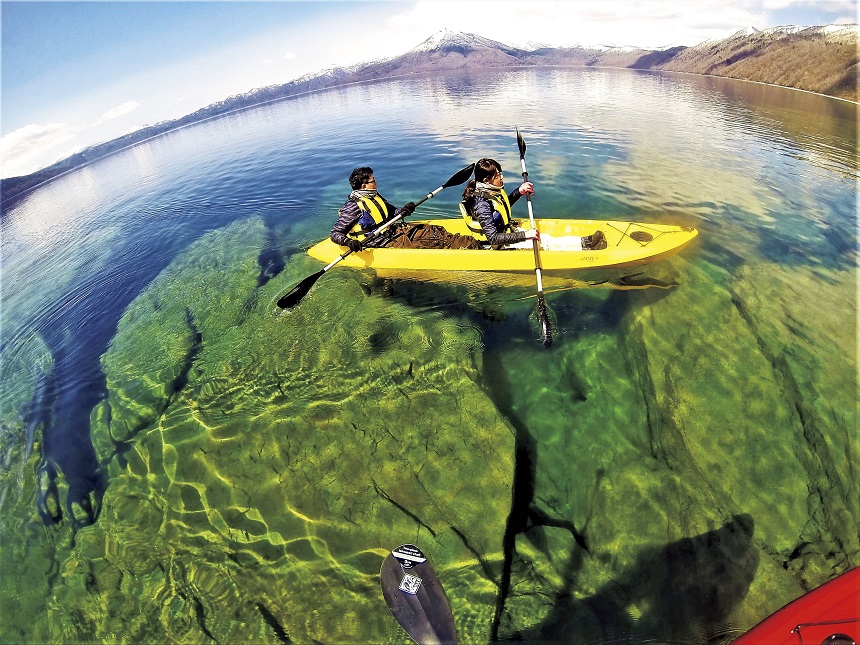 水質日本一を誇る「支笏湖」(しこつこ)。船底が透明な「クリアカヤック」に乗って、美しい湖面や周囲の山々を見ながらカヤックが楽しめます。柱状節理の湖底はもちろん、秋にはヒメマスが見られることも。